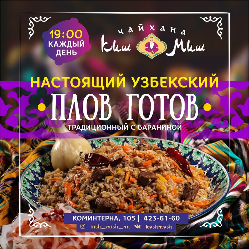Отмечала день рождения в чайхане Киш Миш 01.10.2017. Хочу от всей души поблагодарить за хороший вечер. Начиталась накануне отзывов, были уже сомнения, идти-не идти. Не знаю, к чему придираются люди, нам все понравилось. Хорошая кухня. Все вкусно, порции большие (тут писали, что капельные - неправда). Немного придралась бы только к плову, не совсем тот плов, который ждешь в восточном кафе, у нас в городе ели намного вкуснее. Но мяса в плове было много, и мясо очень вкусное. Все остальное было приготовлено очень хорошо. Мои гости остались сыты и довольны. Обслуживание тоже очень порадовало. Большое спасибо обслуживающей нас девочке (извините, очень стыдно, не запомнила имя, по-моему, Ася, могу ошибаться). Очень милая, вежливая, при этом все четко, без накладок, все вовремя подавалось, убиралось, ответила на все вопросы по меню, вообще не к чему придраться, очень приятное обслуживание. Очень приятная девушка-администратор. Общение с ней оставило очень благоприятное впечатление. Все улыбчивые, радушно встретили, хорошо проводили. Очень понравилось отношение всего персонала. Ну, и как вишенка на торте - от кафе очень мило поздравили меня с днем рождения. Включили поздравительную музыку, сказали душевные слова, угостили домашней очень вкусной настойкой, преподнесли торт со свечечкой. Ну, приятно же!!! Еще раз спасибо :-)